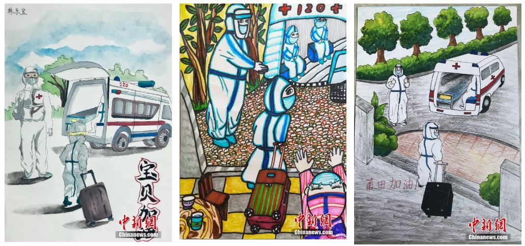 仙游當(dāng)?shù)睾⒆幽闷甬嫻P,表達(dá)對(duì)同齡人的鼓勵(lì)和祝福。三幅圖為莆田學(xué)院附屬實(shí)驗(yàn)小學(xué)的兒童畫。