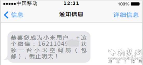 經(jīng)了解,一天前,張女士收到一條中獎短信,提示其已成為小米用戶,可獲領(lǐng)一臺小米空調(diào)扇。