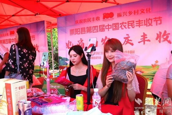 在農產品直播推介展區(qū),主播們現(xiàn)場直播“帶貨”,為網友們推介崇陽縣特色農副產品,吸引了眾多網友咨詢下單。