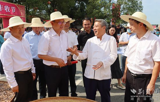 燕兒谷景區(qū)負責人徐志新(右二)向羅田縣委副書記、代縣長周黎(左三)介紹特色農產品豐收情況。通訊員 張曉雨 攝