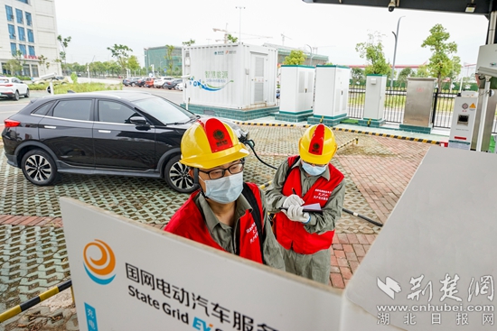 國(guó)網(wǎng)黃岡供電公司員工為充電客戶解答充電問題。通訊員供圖