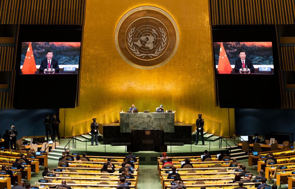 2021年9月21日,習(xí)近平在北京以視頻方式出席第七十六屆聯(lián)合國大會一般性辯論并發(fā)表重要講話。新華社記者王迎攝