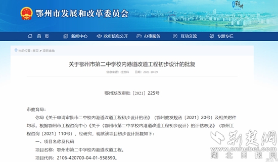 荊楚網(wǎng)(湖北日報網(wǎng))訊(記者 阮瓊)日前,鄂州市發(fā)改委對鄂州市第二中學(xué)校內(nèi)港道改道工程初步設(shè)計進(jìn)行批復(fù)。該項(xiàng)目建設(shè)工期為6個月,概算投資1474.35萬元。