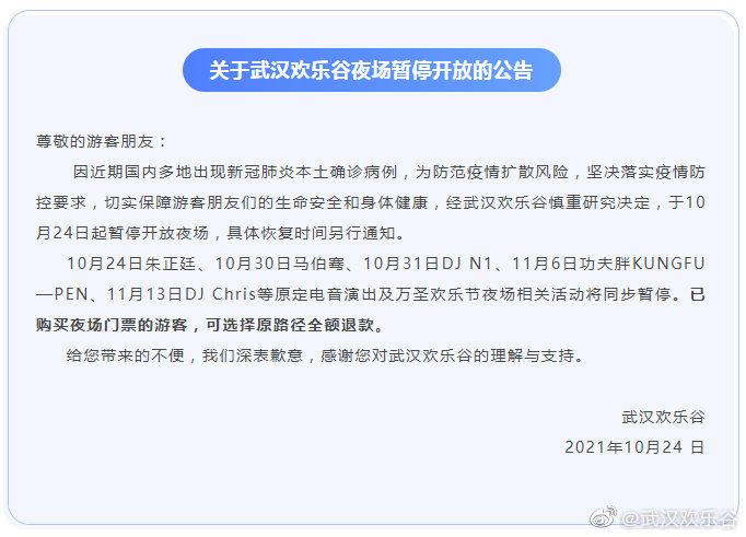 10月24日,@武漢歡樂谷 發(fā)布公告稱,因近期國(guó)內(nèi)多地出現(xiàn)新冠肺炎本土確診病例,為防范疫情擴(kuò)散風(fēng)險(xiǎn),經(jīng)武漢歡樂谷研究決定,于10月24日起暫停開放夜場(chǎng),具體恢復(fù)時(shí)間另行通知。10月24日朱正廷、10月30日馬伯騫、10月31日DJ N1、11月6日功夫胖KUNGFU—PEN、11月13日DJ Chris等原定電音演出及萬(wàn)圣歡樂節(jié)夜場(chǎng)相關(guān)活動(dòng)將同步暫停。已購(gòu)買夜場(chǎng)門票的游客,可選擇原路徑全額退款。