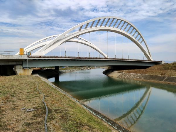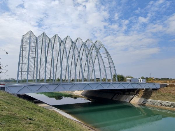 荊楚大道跨總干渠橋位于總干渠雙喜街道譚店村段,在生態(tài)科技城東路跨總干渠橋西1公里左右。主橋梁長(zhǎng)90米,引橋長(zhǎng)24米,橋面寬47米,雙向8車(chē)道。該橋?yàn)樾崩瓨颍苍O(shè)11對(duì)吊桿,順橋向索距為6米,為蝶形拱橋。該橋是我市首座市政項(xiàng)目斜拉橋,也是單跨最大的橋梁。荊楚大道跨總干渠后與鳳袁路相接。
