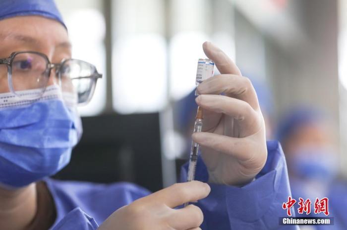 10月27日,江西南昌,南昌大學第二附屬醫(yī)院紅角洲院區(qū)接種點,護士使用注射器抽取新冠疫苗。中新社記者 劉力鑫 攝