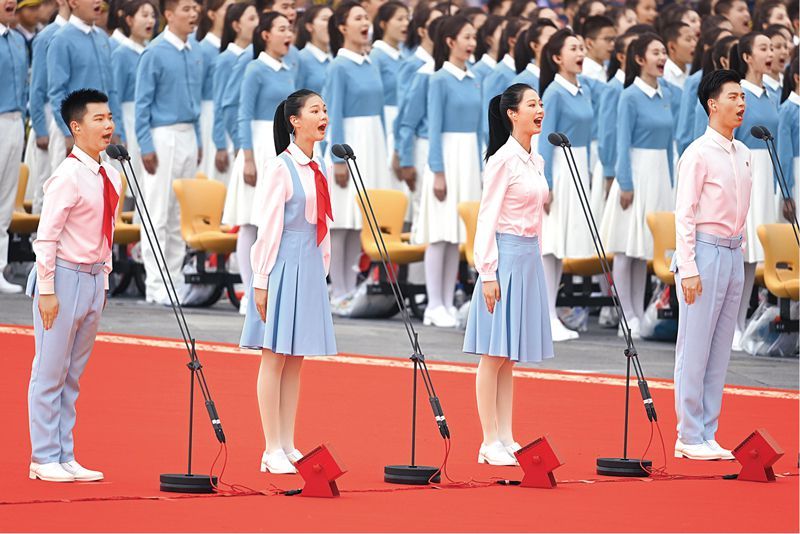 2021年7月1日上午,慶祝中國共產(chǎn)黨成立100周年大會在北京天安門廣場隆重舉行。這是共青團員和少先隊員代表集體致獻(xiàn)詞。 新華社記者 李尕/攝