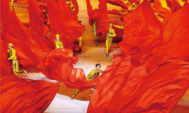 2021年6月28日晚,慶祝中國共產(chǎn)黨成立100周年文藝演出《偉大征程》在國家體育場盛大舉行。這是鼓樂歌舞《新的天地》。 新華社記者 黃敬文/攝
