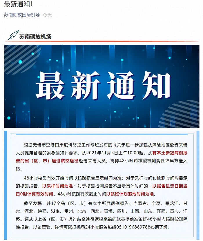 “蘇南碩放國際機場”微信公眾號11月3日消息,請從以下?。▍^(qū)、市)通過航空途徑返錫來錫的旅客提前準備好48小時內(nèi)核酸檢測陰性報告,以備查驗。具體包括:內(nèi)蒙古、寧夏、黑龍江、甘肅、河北、陜西、湖南、貴州、北京、湖北、青海、四川、山西、山東、江西、重慶、江蘇。