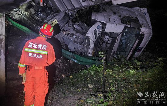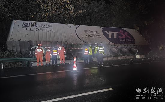 當(dāng)天凌晨3時53分,消防人員第一時間趕到現(xiàn)場經(jīng)偵查發(fā)現(xiàn):在高速路一處橋洞上方,一輛載貨2噸的圓通速遞箱式大貨車撞出護欄外,車廂半邊懸空兩頭側(cè)倒在山體上,恰巧車頭彎折懸空在一條三米多洞坑中,司機受傷被困在方向盤和座椅之間,疼痛難忍不停地喊疼。