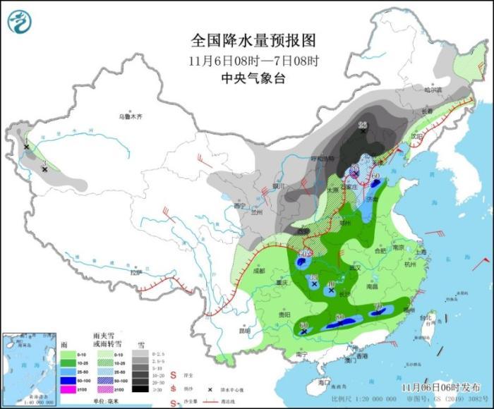 11月6日08時(shí)至7日08時(shí),內(nèi)蒙古中部和東南部、山西大部、河北中北部、北京、天津、遼寧西部以及陜西北部和中南部山區(qū)、河南西部等地的部分地區(qū)有大到暴雪,其中,內(nèi)蒙古中部、河北西北部、山西東北部等地局地有大暴雪(20~28毫米)。華北南部、黃淮中西部、西南地區(qū)東部、江漢西部、江淮西部、江南西部和南部、華南北部等地的部分地區(qū)有中到大雨,其中,山東北部、重慶東部、福建西南部、廣東北部、廣西東北部等地局地暴雨(50~65毫米)。西北地區(qū)中東部、華北西部和北部、東北地區(qū)中南部、黃淮西部、江南東北部等地部的分地區(qū)有4~6級(jí)風(fēng),陣風(fēng)7~8級(jí)(見圖4)。