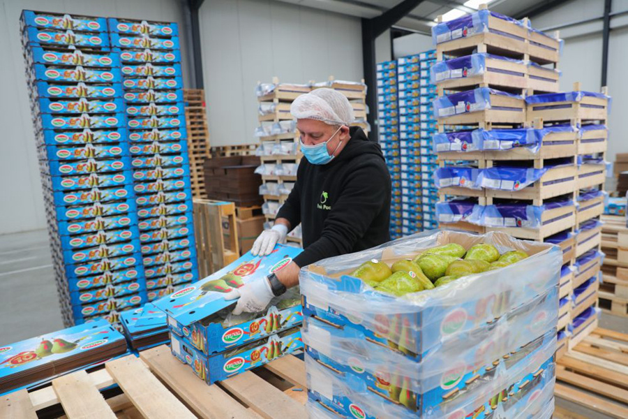 ↑2021年10月22日,工作人員在比利時圣希利斯-瓦斯市的一個水果分揀包裝車間將即將出口的比利時啤梨裝箱。 比利時的朱櫻紅啤梨將在第四屆中國國際進(jìn)口博覽會上與中國消費者見面,進(jìn)入中國市場。
