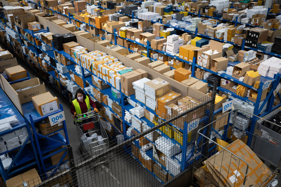 ↑2020年11月11日,工作人員在西班牙瓜達(dá)拉哈拉市的菜鳥海外倉分揀商品?!半p十一”帶動西班牙線上消費新熱潮。
