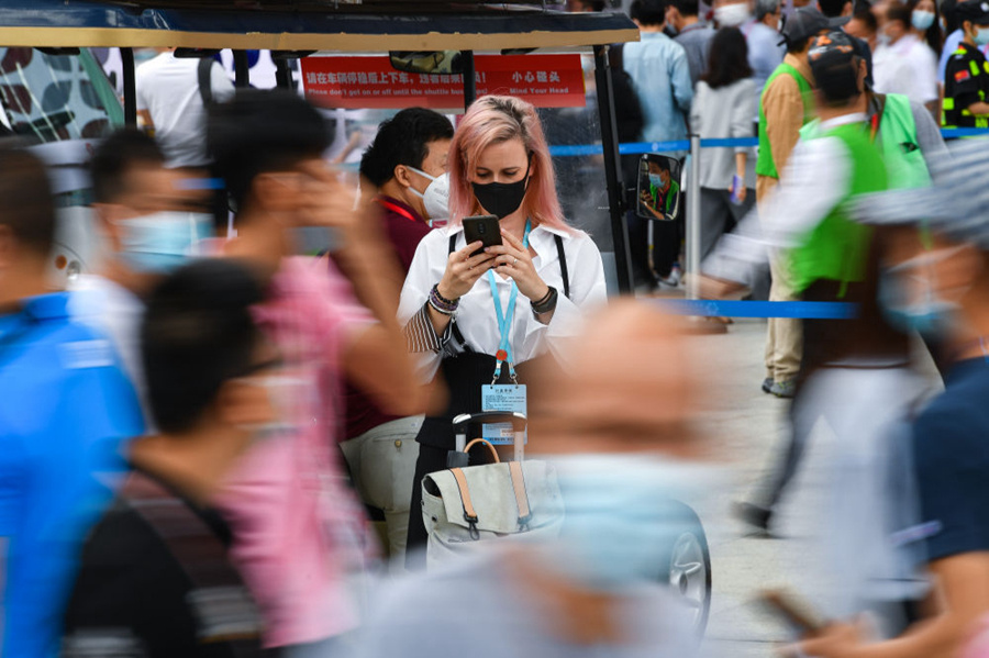 ↑2021年10月15日,生活在廣東佛山的意大利工業(yè)設(shè)計師勞敏妮參加廣交會。