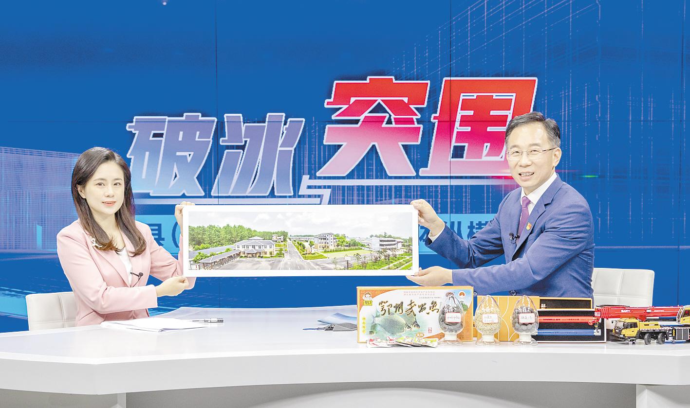 11月3日,鄂城區(qū)委書記董國平(右)做客湖北日?qǐng)?bào)5G演播室。 (湖北日?qǐng)?bào)全媒記者 薛婷 攝)
