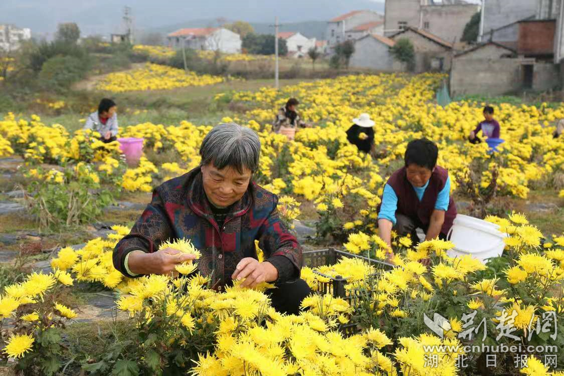 荊楚網(wǎng)(湖北日?qǐng)?bào)網(wǎng))訊(通訊員李暢)11月12日,初冬的太陽暖暖融融的,在大悟縣四姑鎮(zhèn)同興村金絲皇菊種植基地,農(nóng)民正在采摘豐收的菊花。百畝菊花競相開放,耀眼奪目。漫山遍野,金燦燦、一簇簇,吸引不少游人前來觀賞拍照,成為來四姑鎮(zhèn)賞紅葉的又一處“網(wǎng)紅打卡地”。