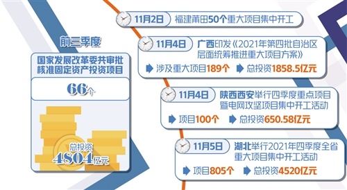 11月4日,廣西印發(fā)《2021年第四批自治區(qū)層面統(tǒng)籌推進重大項目方案》,涉及重大項目189個,總投資1858.5億元,涵蓋交通、新能源、商貿(mào)物流、基礎(chǔ)設(shè)施、衛(wèi)生事業(yè)等多個領(lǐng)域。11月5日,湖北舉行2021年四季度全省重大項目集中開工活動,805個項目總投資達4520億元。