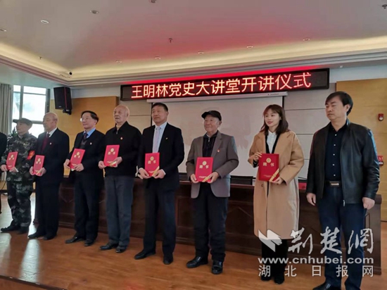 開講儀式上,黃石港區(qū)有關(guān)領(lǐng)導向王明林黨史大講堂宣講團成員頒發(fā)了聘書。王明林主講了第一課,內(nèi)容為中共一大到十九大精神。