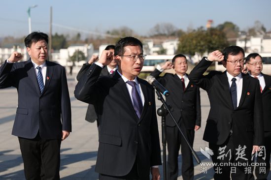 紅安縣委新一屆領(lǐng)導(dǎo)班子在七里坪紅軍廣場宣誓。通訊員 供圖