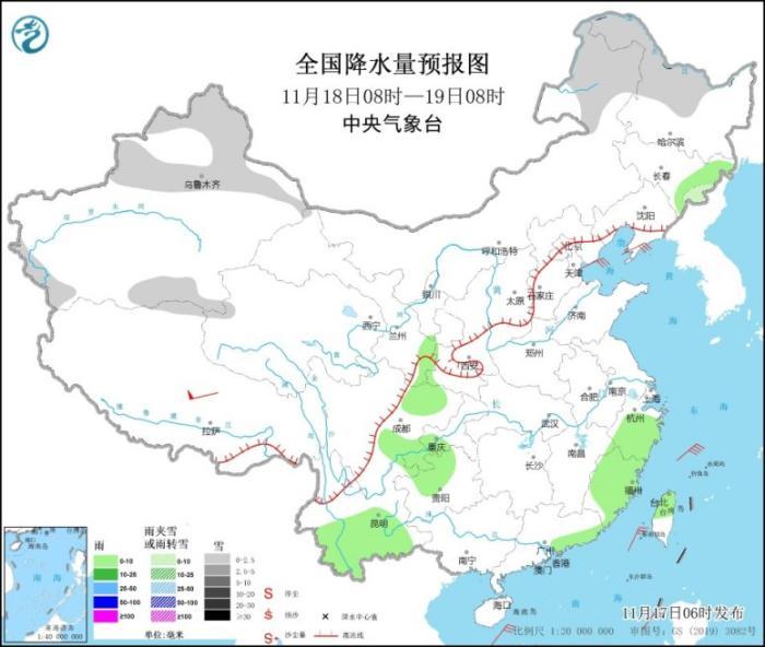 圖2 全國降水量預報圖(11月17日08時-18日08時)