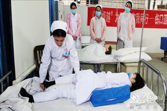 她采用真人實(shí)操進(jìn)行現(xiàn)場(chǎng)良姿位的擺放,例如:患者一側(cè)肢體偏癱如何協(xié)助左右翻身、單人搬運(yùn)到輪椅,使頭身足處于功能體位、避免肢體受壓、預(yù)防墜床及跌倒等??浦R(shí)。