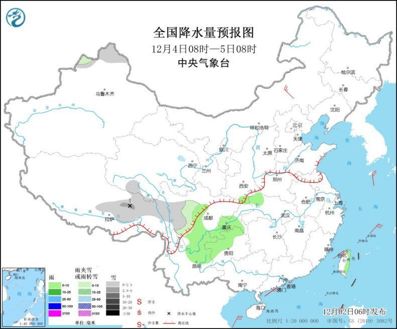 12月4日08時至5日08時,新疆北疆北部、西藏東北部、青海南部、川西高原等地部分地區(qū)有小到中雪或雨夾雪。四川盆地西部和南部、重慶南部、貴州西部和北部、云南東北部、湖北西北部、臺灣島東部等地部分地區(qū)有小雨。內(nèi)蒙古中部部分地區(qū)有4~5級風(fēng)。臺灣海峽、巴士海峽、南海西部和北部海域?qū)⒂?~7級大風(fēng),部分海域風(fēng)力超過8級。