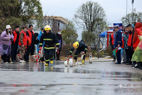參賽隊(duì)員正在進(jìn)行“打早打小”出水滅火操比賽。通訊員 供圖
