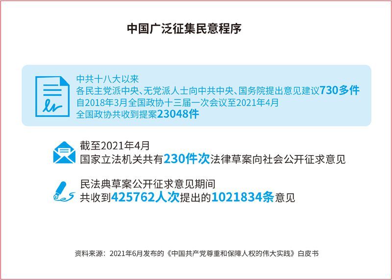 “立法直通車”。全國人大常委會法工委近年設(shè)立了“基層立法聯(lián)系點”,使百姓意見抵達國家最高立法機關(guān)有了“直通車”。到2021年10月,全國22個基層立法聯(lián)系點共為126部法律草案、年度立法計劃等提供7800余條意見建議,其中2200余條意見建議被不同程度吸收采納,使立法更加精細化。