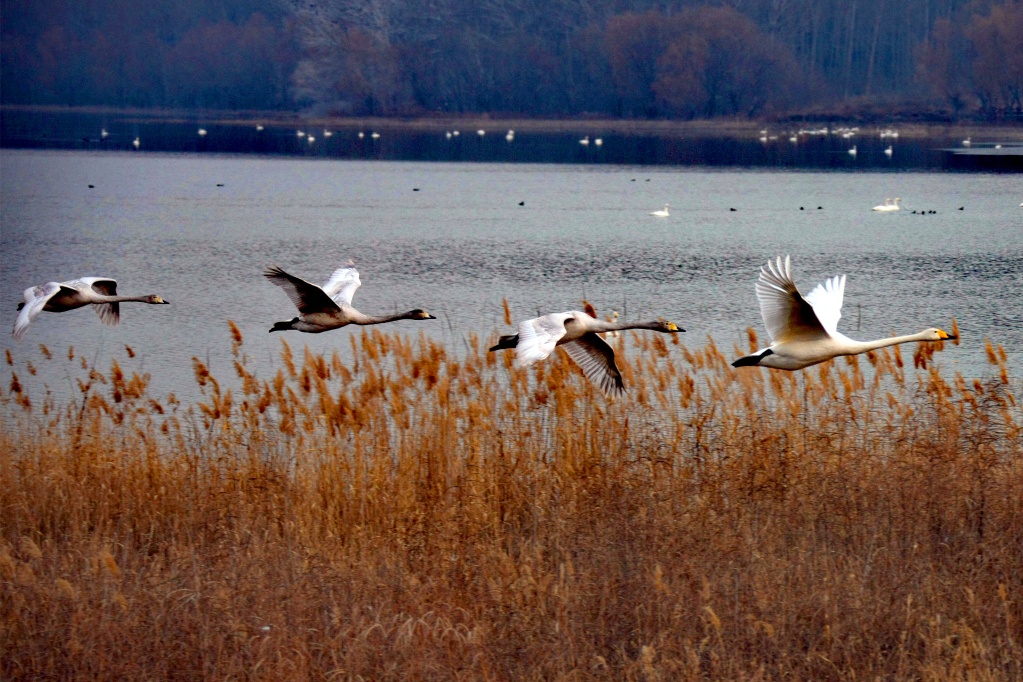 黃河三門峽境內(nèi)的天鵝。新華社記者 劉詩(shī)平攝