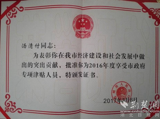 湯清付獲專項(xiàng)津貼。通訊員 供圖
