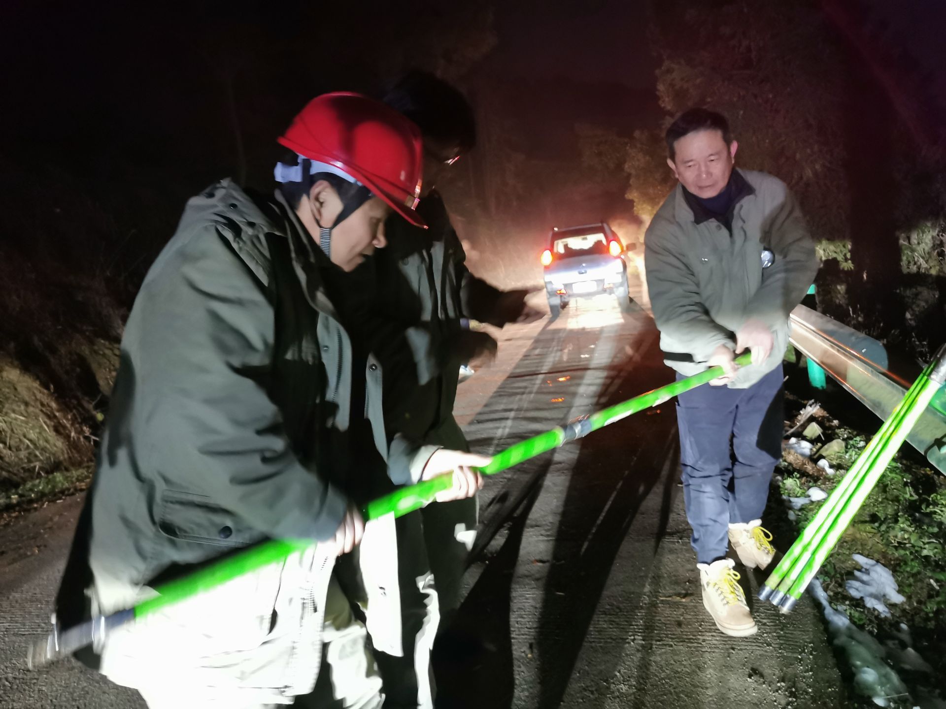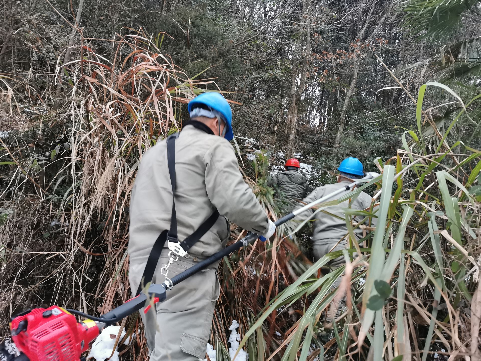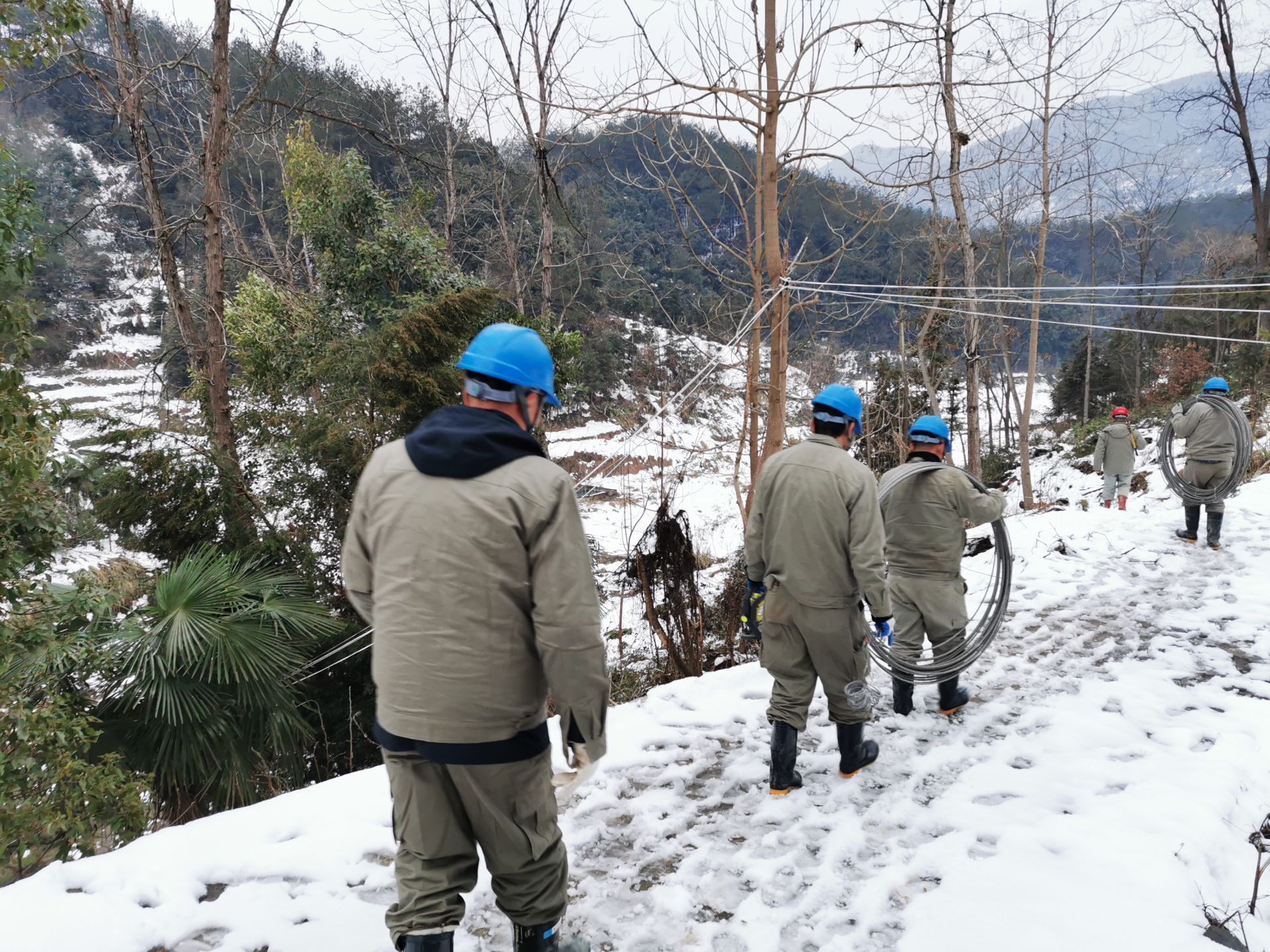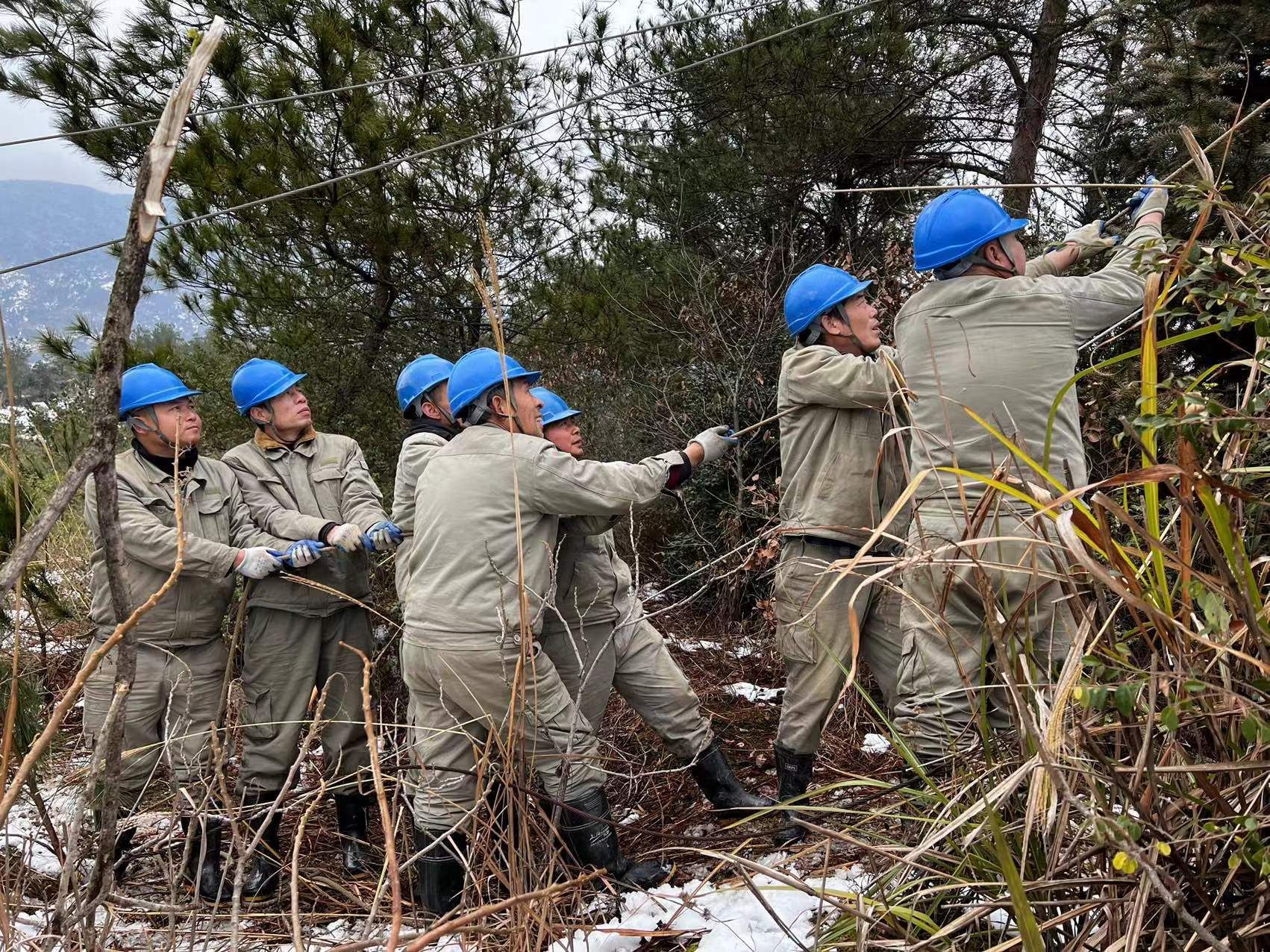 三溪、王英、楓林、排市等山區(qū),故障點(diǎn)多在密林深處,地形復(fù)雜,而且山路濕滑,一般車輛上不去,員工只能身扛搶修物資步行翻山越嶺巡線,一處處的尋找故障。山區(qū)溫度平均在零度以下,搶險(xiǎn)人員衣服濕透,分不清汗水和雪水,臉被凍得如刀割,從早到晚,連續(xù)十個(gè)小時(shí),滴米未進(jìn),運(yùn)桿、拆桿、立桿、架線、接線....全身心投入搶修。