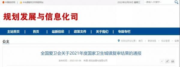 根據(jù)國家衛(wèi)生城鎮(zhèn)相關(guān)評(píng)審管理辦法和標(biāo)準(zhǔn),全國愛衛(wèi)辦組織專家對(duì)2021年進(jìn)入復(fù)審程序的國家衛(wèi)生城市(區(qū))進(jìn)行了評(píng)審,對(duì)各地上報(bào)的國家衛(wèi)生鄉(xiāng)鎮(zhèn)(縣城)復(fù)審結(jié)果進(jìn)行了抽查。根據(jù)暗訪和評(píng)審結(jié)果,重新確認(rèn)北京市房山區(qū)等270個(gè)城市(區(qū))為國家衛(wèi)生城市(區(qū)),重新確認(rèn)北京市豐臺(tái)區(qū)王佐鎮(zhèn)等234個(gè)鄉(xiāng)鎮(zhèn)(縣城)為國家衛(wèi)生鄉(xiāng)鎮(zhèn)(縣城)。我市入選2021年重新確認(rèn)國家衛(wèi)生城市(區(qū))名單。
