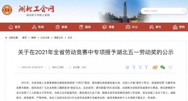 10日,湖北工會(huì)網(wǎng)發(fā)布了《關(guān)于在2021年全省勞動(dòng)競賽中專項(xiàng)授予湖北五一勞動(dòng)獎(jiǎng)的公示》。公示指出,根據(jù)全省勞動(dòng)競賽活動(dòng)的工作安排,經(jīng)過各級(jí)工會(huì)自下而上、逐級(jí)把關(guān)、擇優(yōu)推薦、嚴(yán)格審核,湖北省總工會(huì)擬對在2021年全省勞動(dòng)競賽中貢獻(xiàn)突出的一批優(yōu)秀集體和個(gè)人專項(xiàng)授予湖北五一勞動(dòng)獎(jiǎng)。名單包括湖北五一勞動(dòng)獎(jiǎng)狀10個(gè),湖北五一勞動(dòng)獎(jiǎng)?wù)?0人,湖北省工人先鋒號(hào)30個(gè)。