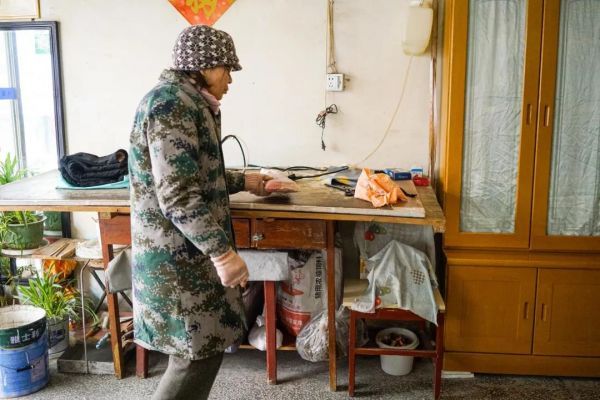 之前幫醫(yī)院做制服沒用完的白色料子,整齊的列在墻角,旁邊就是餐桌?!澳昙o(jì)大了,這些活兒費(fèi)眼費(fèi)頸椎,可能也干不了幾年了”。