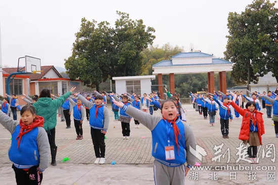 同學們在舉行簡樸而又莊重的升國旗儀式后,高唱《沒有共產黨就沒有新中國》,并集體做起了歡快律動的武術操、繩操和手指舞。