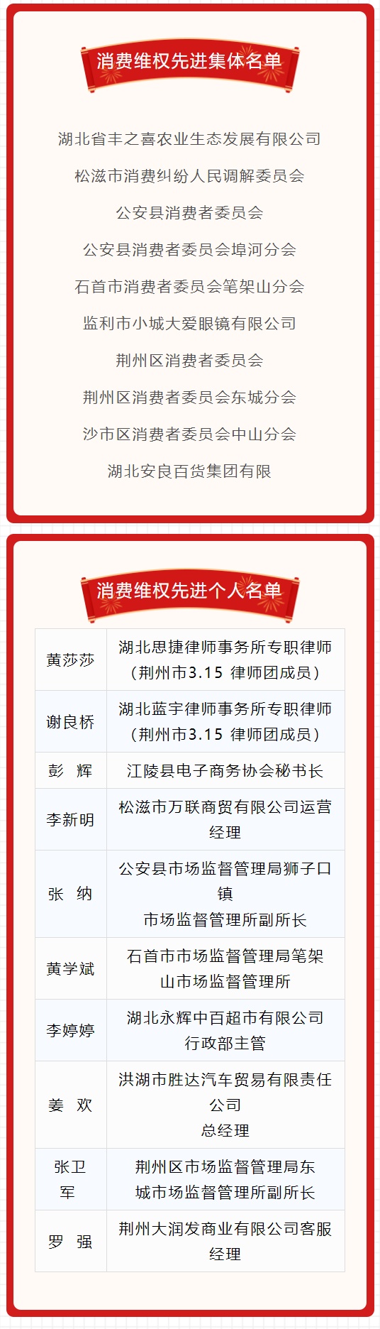 近日,荊州市消費者委員會印發(fā)《關于表彰2021年度荊州市消費維權先進集體、先進個人的決定》,授予10家單位“消費維權先進集體”榮譽稱號;授予10名同志“消費維權先進個人”榮譽稱號。