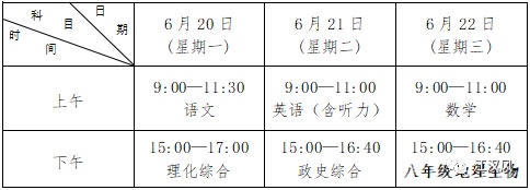 各科考試時長為:語文150分鐘,數(shù)學(xué)、英語(含聽力)、理化綜合各120分鐘,政史綜合、地理生物合卷各100分鐘。具體考試時間安排如下: