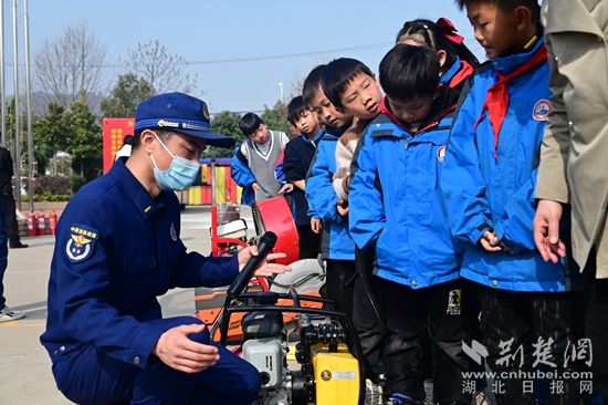 消防宣傳員帶領(lǐng)學生們近距離參觀消防車和裝備器材,組織學生穿戴各類消防服裝、裝備,對學生們提出的消防各類話題和提問進行互動交流,寓教于樂的消防知識學習、新奇的裝備器材讓學生們耳目一新,在潛意識中培養(yǎng)了學生們消防安全意識。