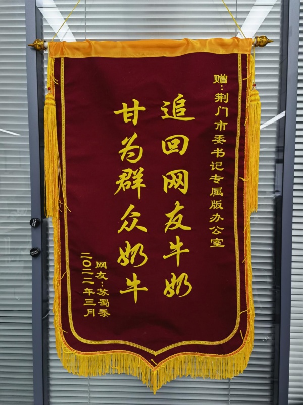 3月7日一早,荊門市委書記專屬版辦公室工作人員在辦公室門口發(fā)現(xiàn)了一面錦旗,上書“追回網(wǎng)友牛奶,甘為群眾奶?!?。