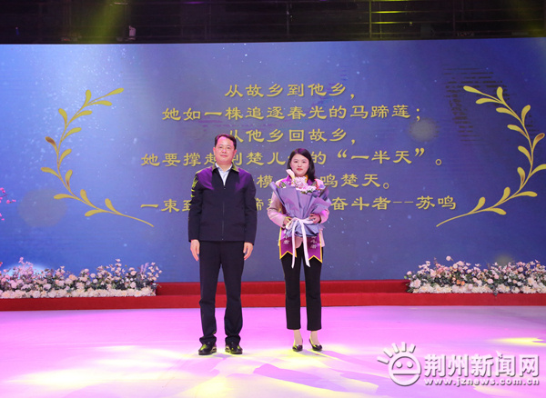 圖為:市委副書記周向陽為“楚楚動人?最美巾幗奮斗者”蘇鳴(代領(lǐng))送上祝福