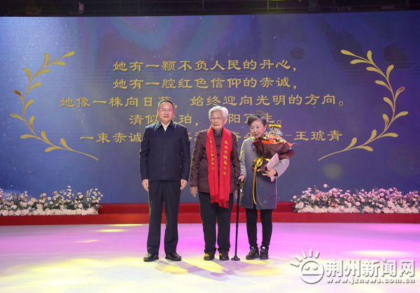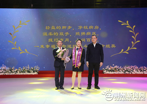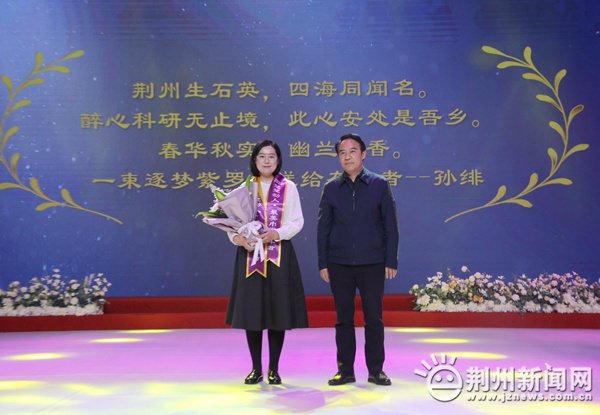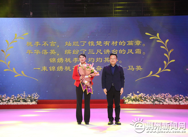 圖為:市政協(xié)主席蔣鴻為“楚楚動人?最美巾幗奮斗者”馬英送上祝福