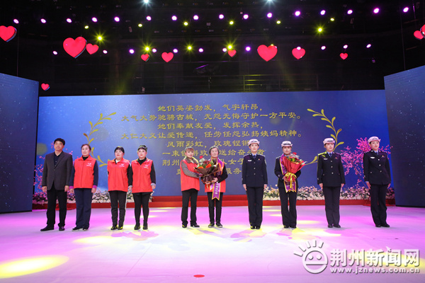圖為:市人大常委會主任段昌林為“楚楚動人?最美巾幗奮斗者”荊州交警五大隊女子中隊、彭國珍志愿服務(wù)隊送上祝福