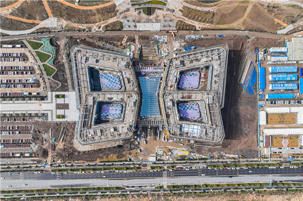 3月7日,無人機(jī)從空中俯瞰荊州市民之家項(xiàng)目建設(shè)現(xiàn)場,一派繁忙景象。