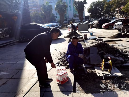 江南名居物業(yè)經(jīng)理見施工隊忙得熱火朝天,主動送來兩箱礦泉水,感謝他們的辛苦付出,他說:“為了居民的出行安全,你們辛苦了?!?/p>