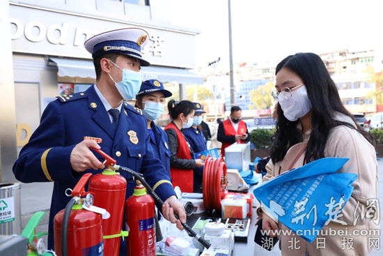消防員向過(guò)往群眾科普如何鑒別假冒偽劣消防產(chǎn)品。通訊員供圖