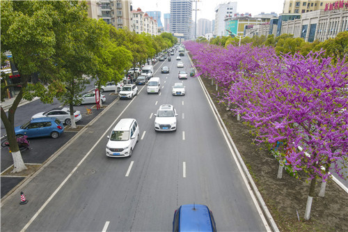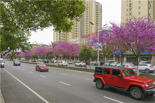 我市城區(qū)為打造“一路一景”景觀(guān)效果,武德路上種植的是“四季春1號(hào)”紫荊樹(shù)。該樹(shù)花期為3月中旬至4月中旬,花色為醒目的紫紅色,花量大、花密生、花期長(zhǎng),先花后葉,觀(guān)花效果非常震撼。
