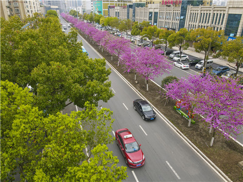近日,在無(wú)人機(jī)鳥(niǎo)瞰下,正值花期的荊州市樹(shù)紫荊讓沙市區(qū)武德路變成了“花蔭大道”,美不勝收。