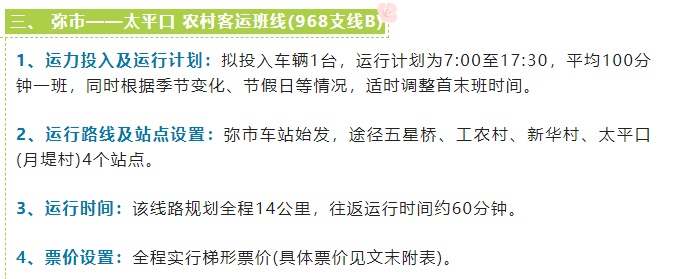 荊州至彌市農(nóng)村客運(yùn)班線公交化改造投入運(yùn)行后,運(yùn)營(yíng)線路、??空军c(diǎn)及票價(jià)將根據(jù)實(shí)際運(yùn)營(yíng)情況進(jìn)行適當(dāng)優(yōu)化和調(diào)整。