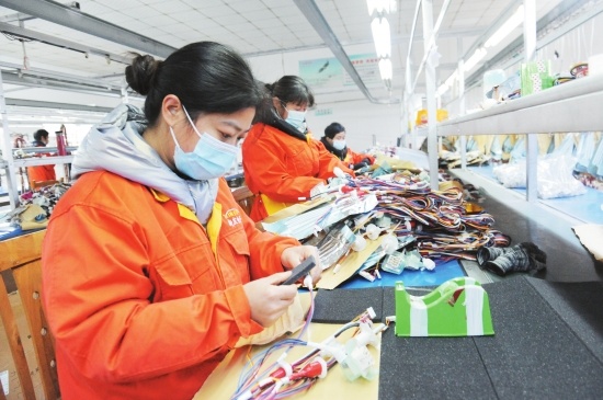 3月19日,荊州市新發(fā)電子科技有限公司車間內(nèi),工人們正在盤電線、纏膠帶、做檢測(cè)。