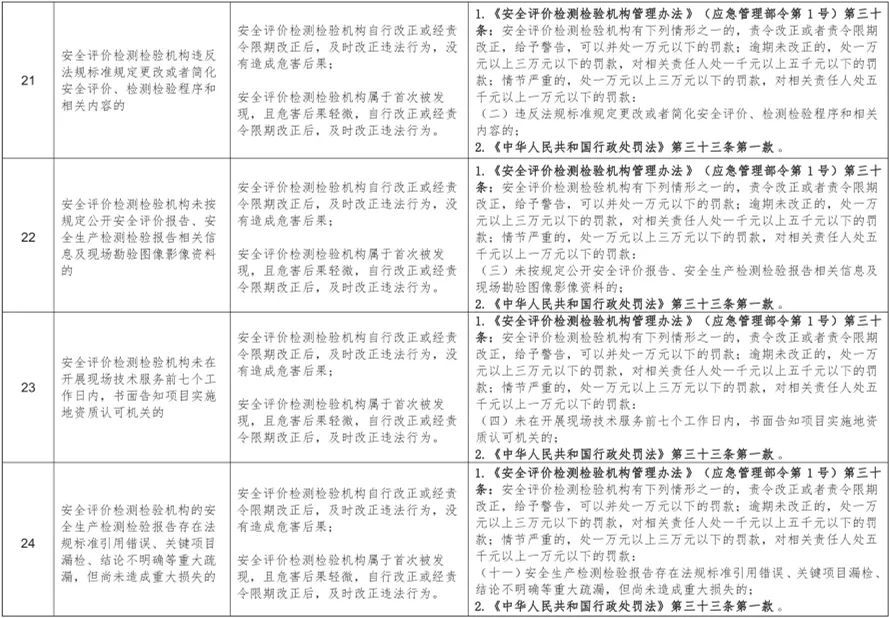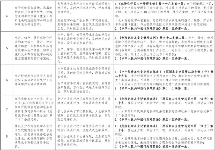 《清單》對危險化學品生產企業(yè)安全警示標志設置、風險辨識評估、應急預案評審、事故風險告知、安全教育培訓、安全評價檢測檢驗等類別24項輕微違法行為,屬于首次被發(fā)現(xiàn)并及時糾正,且危害后果輕微的,不予行政處罰。